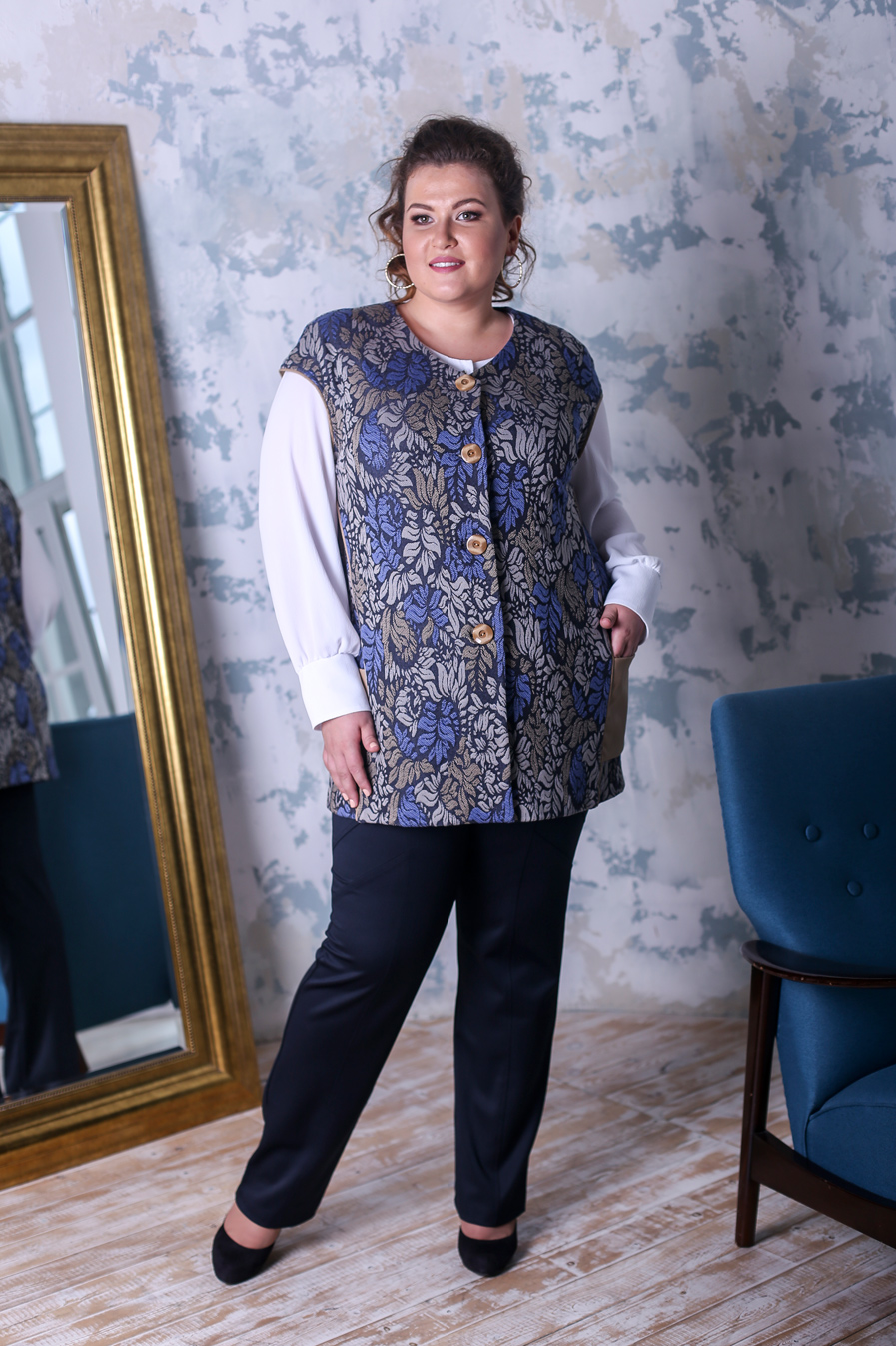 Эффектный, удлиненный жилет прямого силуэта со спущенным плечом и V - образной горловиной. По полочке изделия выполнены фигурные рельефы украшенные кантом из иск. кожи с перфорацией. Между боковым швом и рельефом вставлен накладной карман, выполненный так же из иск. кожи. По спинке выполнены выточки для обеспечения прилегания. Пройма жилета обработана кантом из иск. кожи с перфорацией. Изделие имеет застежку на петли пуговицы. Сочетание в изделии трикотажного жаккарда и иск. кожи в наступающем сезоне очень актуально. Жилет имеет великолепную посадку и оптимальную длину, а модный принт и богатая цветовая гамма сделают изделие любимым.