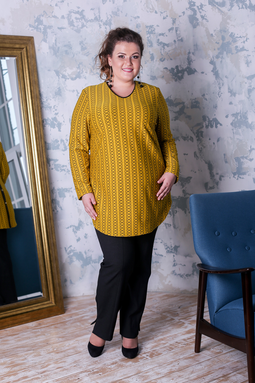 Стильная, эффектная туника полуприлегающего силуэта, с втачным, длинным рукавом и V - образной горловиной. По переду туники выполнены модные углом вытачки, для обеспечения оптимального прилегания в области груди. По спинке так же выполнены выточки для обеспечения прилегания. Вырез туники украшен декоративным, рельефным кантом. Спинка туники имеет декоративную, отлитную планку, выполненную из иск. с тиснением под кружево кожи и украшенную красивыми пуговицами. Красивый, разноуровневый низ изделия зрительно вытягивает силуэт и стройнит фигуру. Сочетание в изделии трикотажного жаккарда и иск. кожи в наступающем сезоне очень актуально. Блуза имеет великолепную посадку и оптимальную длину, а модное сочетание горчичного и черного цветов сделают тунику любимой.