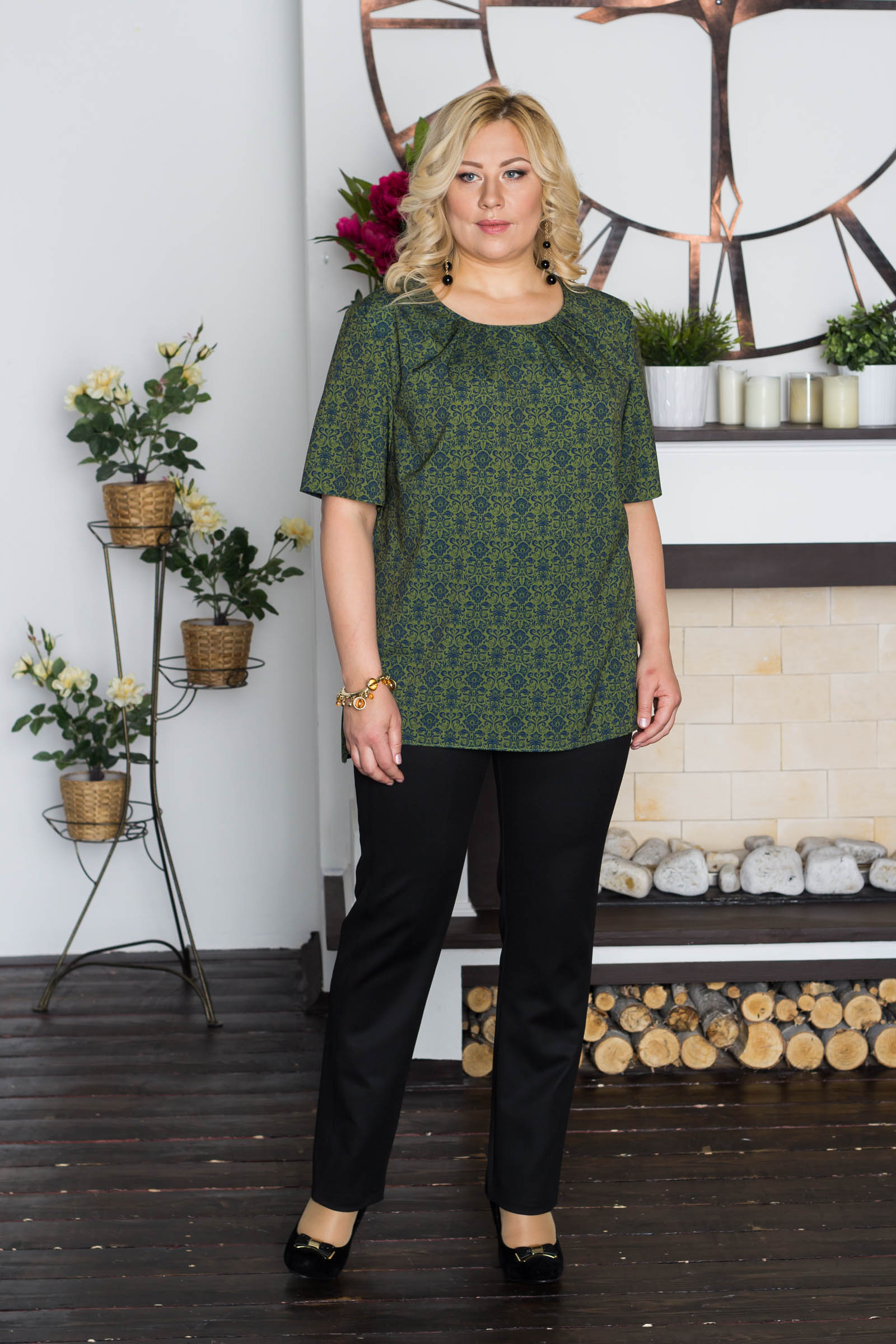 Струящаяся, женственная туника полуприлегающего силуэта выполнена из качественного мосскрепового полотна в сочном горчичном и оливковом цветах, с нанесенным геометрическим принтом с эффектом печати 3D. Овальный вырез горловины украшен симметрично расположенными защипами. Изюминкой туники является стильный, разноуровневый низ. В комплекте к тунике предлагаются зауженные, брюки ОСКАР в однотонных классических цветах. Данный комплект идеально подойдет и для офиса и для вечернего выхода.