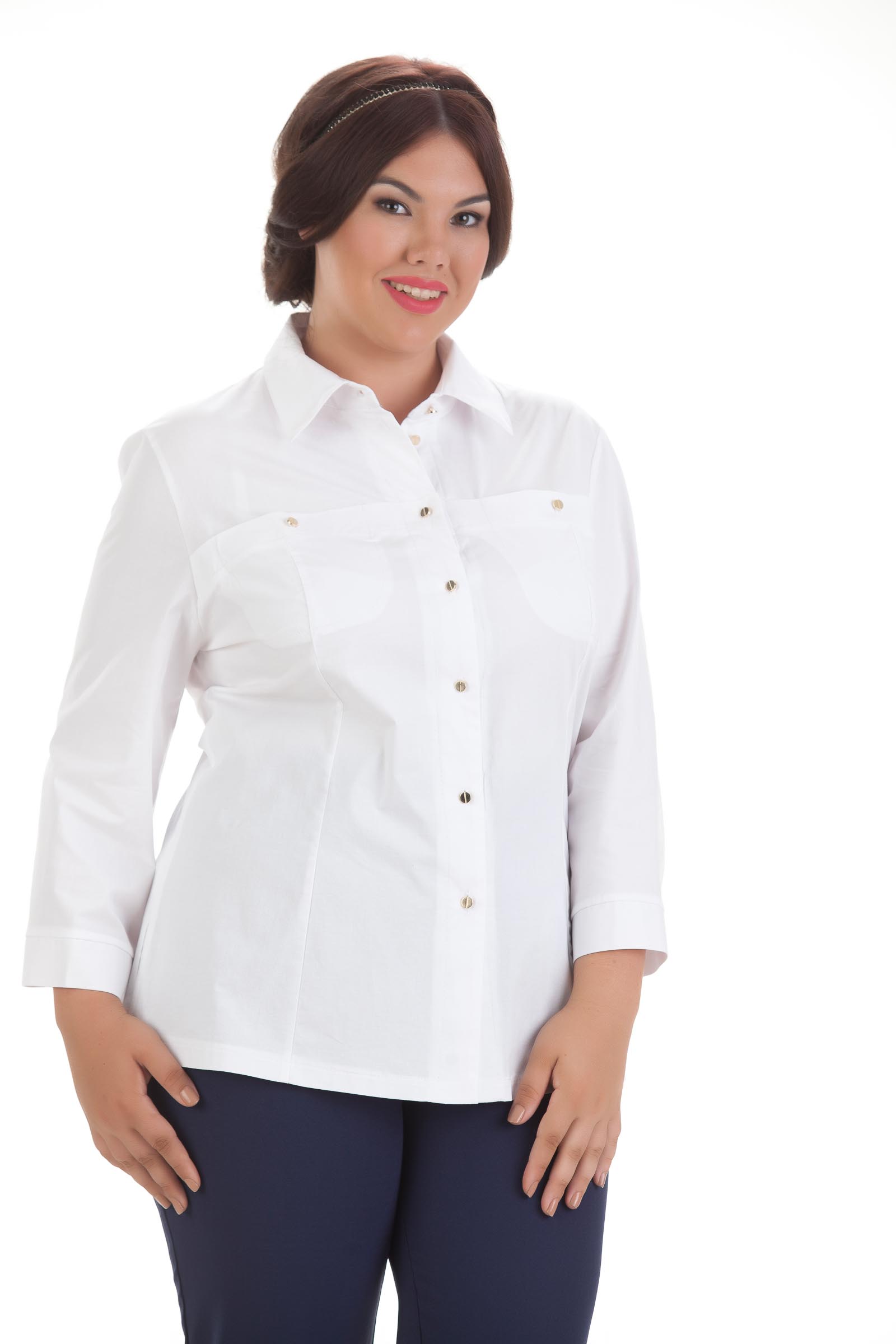 Повседневная, офисная блуза, рубашечного типа, полуприлегающего силуэта. Выполнена из качественного, тонкого, хлопкового полотна с эластаном. Блуза имеет элегантную, декоративную планку над линией груди, переходящую в потайные карманы, украшенные узорчатыми, золотыми, металлическими пуговицами и застежку на петли-пуговицы. Рельефы по полочке переходят в декоративную планку, что позволяет вытянуть силуэт изделия и обеспечить безупречную посадку по фигуре. Втачной рукав заканчивается манжетой с застежкой на пуговицы. Аккуратный воротник "рубашечного типа"добавляет изделию элегантности. По спинке изделия предусмотрены выточки для оптимального прилегания, в боковых швах имеются разрезы для наилучшей посадки по бедрам. Блуза имеет декоративную отстрочку, это добавляет изделию еще больше элегантности, и обеспечивает достойный, внешний вид. Мы предлагаем данную блузу в классическом, белом цвете, а так же в ультрамодном принте желтого цвета на темно синем фоне. Блуза КАРИНА идеально комбинируется с брюками ОСКАР в принте "мелкая гусиная лапка" или с брюками БЭСИ в однотонных цветах. Данный комплект поможет создать вам великолепный, элегантный образ для работы. А в принтовонном варианте очень стильно будет выглядеть комплект с джинсами МЕРСЕДЕС.