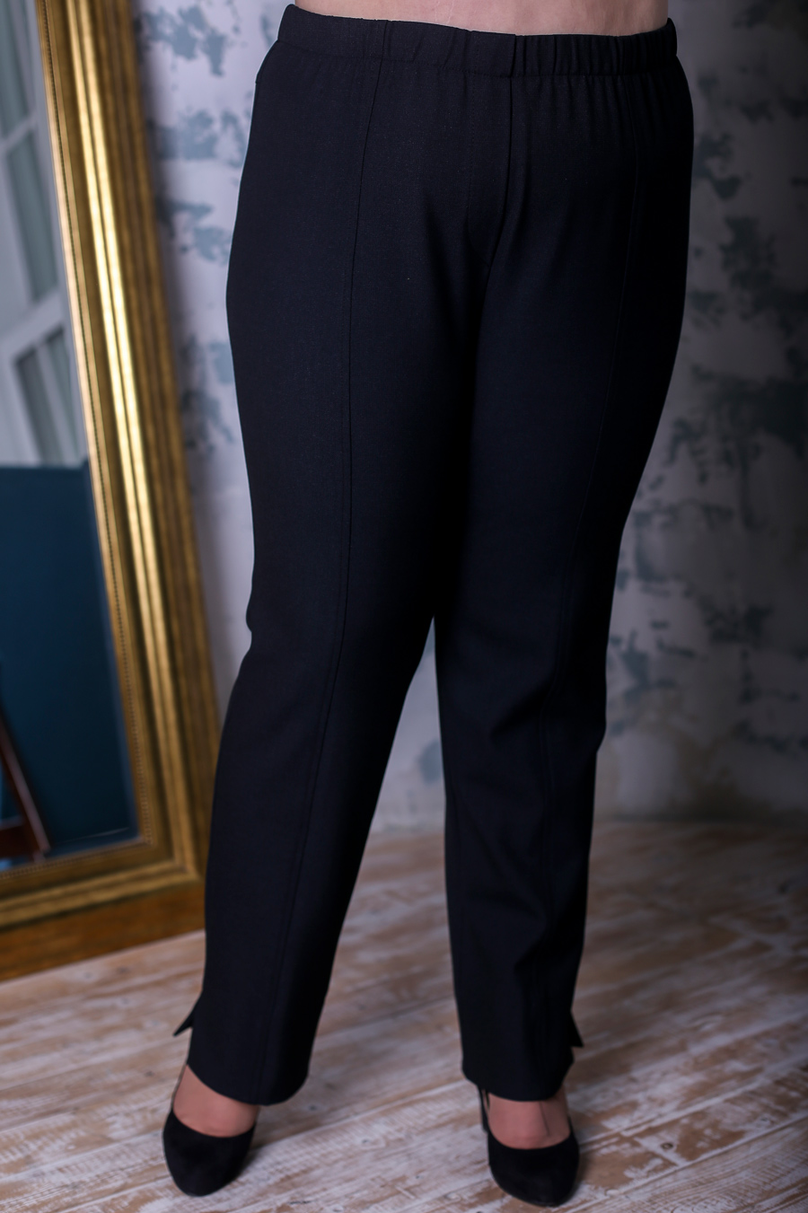 Офисные, стильные, зауженные от середины линии бедра к низу брюки. Выполнены из качественного, плотного костюмного полотна (зимней толщины 380 гр/кв.см.) в черном и чернильном цветах с эластаном, с богатой, лицевой повсерхностью, с узорчатым рисунком. У брюк высокая посадка, по спинке выполнена декоративная кокетка. По переду брючины выполнен вертикальный рез по центру, что позволяет вытянуть силуэт, в боковом шве по низу выполнен декоративный разрез. Все швы выделены декоративной отстрочкой. Пояс брюк собран на широкую резину, что обеспечивает определенный комфорт и отличную посадку на фигуру, молнии нет, есть имитация гульфика. Брюки АЛИССИЯ идеально комбинируется с туниками, блузами, жакетами и пальто из новой осенней коллекции. И позволят создать вам идеальный образ как для работы в офисе, так и для повседневных выходов.