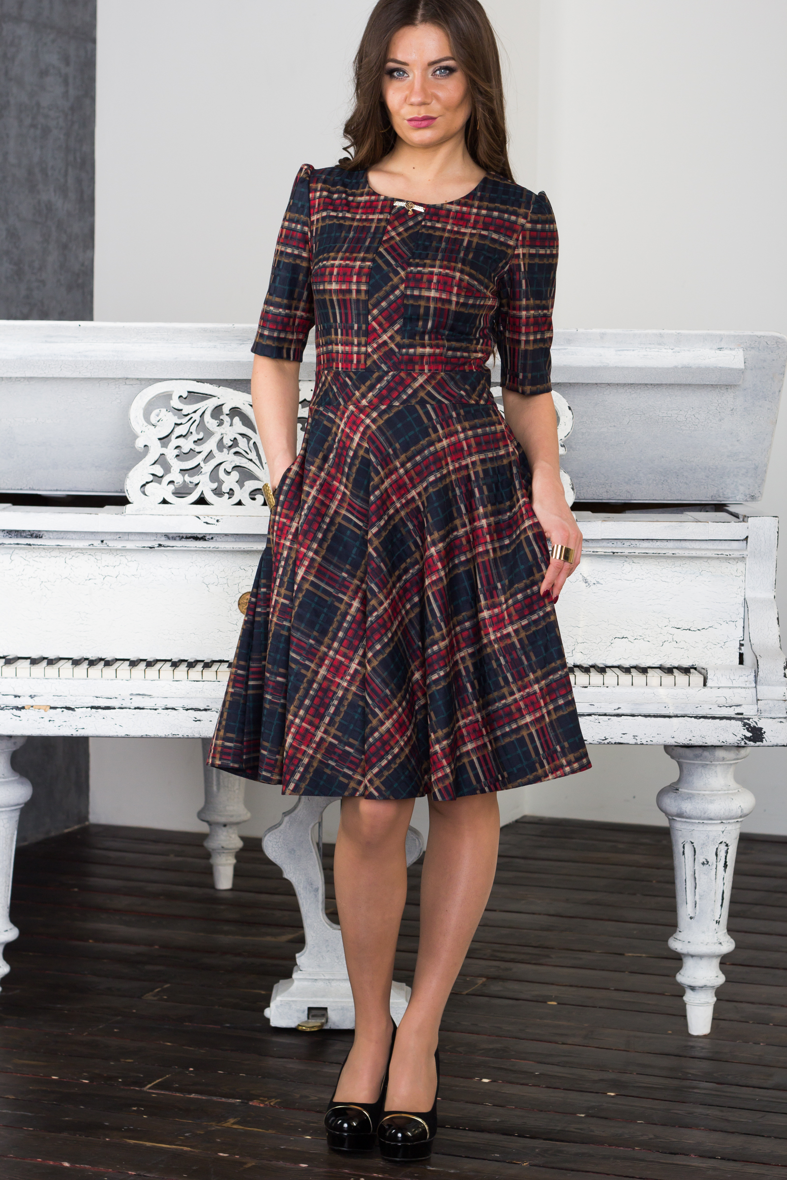 Повседневное платье полуприлегающего силуэта с пышной юбкой для молодых женщин выполнено в романтическом стиле. Изделие выполнено из натурального костюмного, пестротканого полотна в изысканной цветовой гамме синего, зеленого, песочного и красного цветов, без воротника и с втачным, зауженным рукавом длиной ¾ с манжетой. Полочка платья имеет круглый вырез, по центру выполнена вертикальная, декоративная полоса, выкроенная по косой, что зрительно позволяет вытянуть силуэт изделия. В боковом шве предусмотрен потайной замок. Правильно выполненные грудные выточки обеспечивают необходимое, комфортное прилегание. Отрезной пояс платья выкроен по косой, что позволяет подчеркнуть талию. Юбка платья это четверть солнца так же выкроена по косой, мягко ложится плавными складками. В боковых швах юбки предусмотрены удобные карманы. Горловина платья обработана обтачками. В качестве фурнитуры мы использовали стильное, пришиваемое, золотое, металлическое украшение. По спинке изделия предусмотрены выточки для оптимального прилегания. Платье длиной до линии середины колена. Это платье одинаково великолепно подойдет как для праздничных мероприятий, так и для рабочих будней. А великолепная посадка, модный фасон, качественная, натуральная ткань, изысканная цветовая гамма, сделают платье любимым в гардеробе любой девушки.