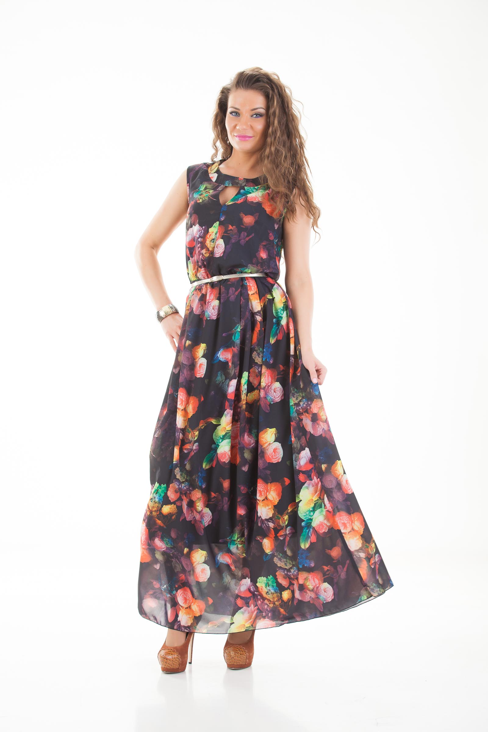 Праздничное, женственное платье, полуприлегающего силуэта с актуальной для сезона ЛЕТО 2015 длиной макси. Выполнено из летящего мосс крепа в цветовой гамме нежных тонов желтого, бирюзового и зеленого цвета. Платье имеет милый принт мелкие бутоны. У платья красивый, круглый вырез переходящий в изящную каплю на груди, пройма платья отделана окантовкой, по поясу предусмотрена резинка, для наилучшей посадки изделия на фигуру. Шикарная юбка украшена встречными складками придающими изделию нужную пышность, но не увеличивающими бедра. Платье имеет подклад телесного цвета из трикотажного полотна. В комплекте с платьем идет золотой, лаковый ремень с красивой золотой пряжкой. Обладательница данного наряда всегда будет выглядеть женственно и эффектно как в повседневных буднях, так и на любом праздничном мероприятии.Вид застежки: нет. Силуэт: полуприлегающий.